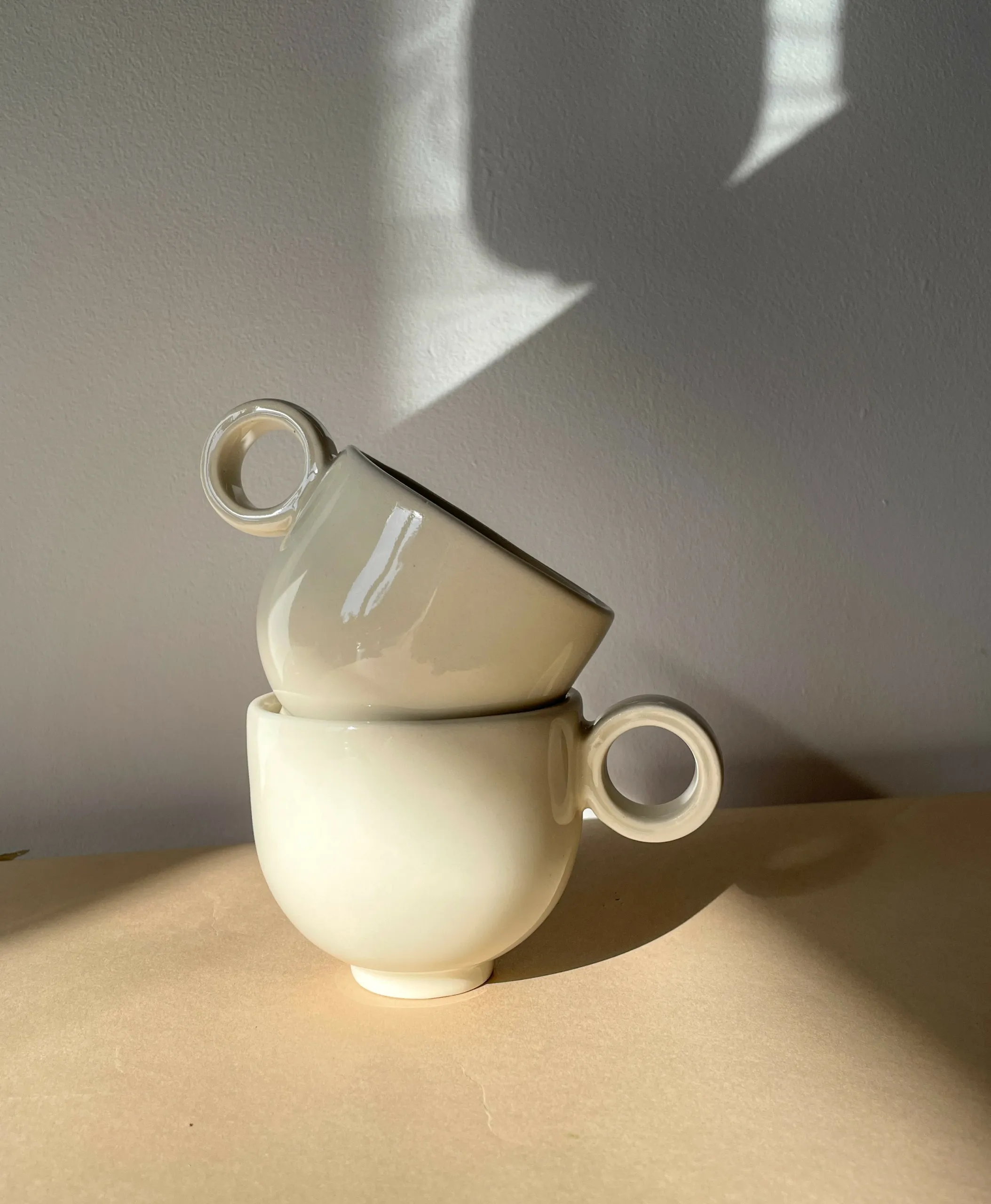 Ceramic cup with a unique round handle – simple, minimalist design perfect for coffee or tea. Available in multiple color options with a glossy glaze.